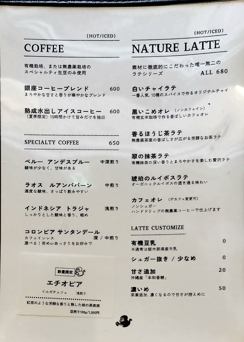 Welcome to Ginza Coffee, a charming café nestled in Tochigi, Japan, where the essence of natural, home-roasted coffee takes center stage. Their menu features an array of delightful concoctions, with the signature 玄米珈琲 made from 100% organic roasted brown rice—completely caffeine-free, priced at just JP¥600.